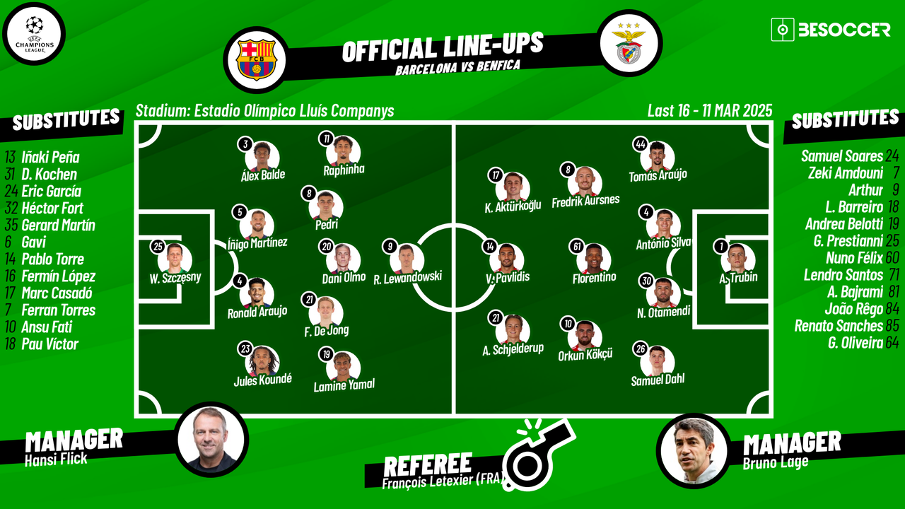 Barcelona, aware of Benfica’s adjustments, strengthened their midfield and attacking options. Their lineup emphasized maintaining possession, quick transitions, and using width to stretch Benfica’s defense. The combination of experience, skill, and tactical awareness allowed Barcelona to dominate key moments and secure the aggregate victory.